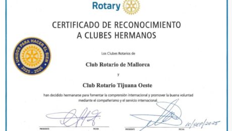El pasado 17 de Septiembre de 2025 tuvo lugar el acto de firma y hermanamiento entre el RC Mallorca y el RC Tijuana Oeste. El hermanamiento Rotario es un concepto por el cual dos clubes de distintas zonas geográficas se emparejan para fomentar el contacto humano y estrechar sus lazos de amistad, además de